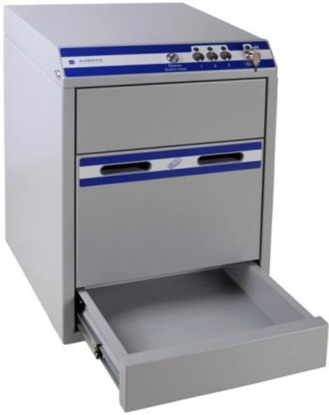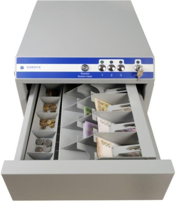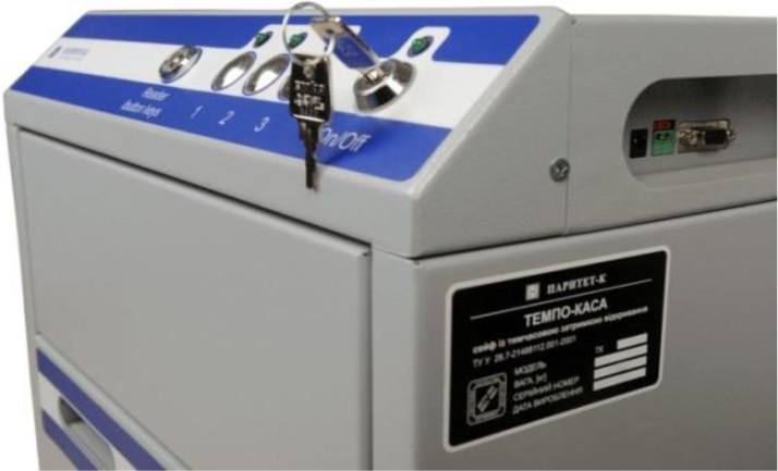 ТЕМПОКАССА - предназначена для безопасного хранения банкнот, монет, ценных бумаг и прочих документов в течение рабочего дня. Исключает открытие ящиков ранее запрограмированного времени при возникновении внештатной ситуации.Преимущества:● Количество ящиков – 3 штверхний ящик - купюрницасредний ящик - ящик инкассатора (оборудован кеш-боксом на 2 отверстия для депонирования)нижний ящик - ящик для документов и печатей● Встроенный аккумулятор, предусматривающий работу при отключении электроэнергии. Время работы от аккумулятора не менее 24 часов (200 открытий).● Индикация работы – светодиоды● Работа с темпокассой осуществляется при помощи ключа● Средний ящик открывается с дополнительным электронным ключом, есть возможность программирования любого ящика на открытие электронным ключом● Временная задержка на открытие – до 30 минут любого ящика● Усиленный анкерный узел, с возможностью крепления к полу. Крепление в комплекте● Выход для подключения внешней «тревожной кнопки»● Замки ящиков – электромеханические