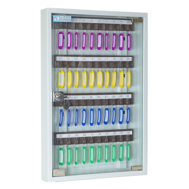 Ключница КЛ-40С предназначена для хранения 40 комплектов ключей. Лицевая панель — стекло мебельное. На задней стенке корпуса расположены отверстия для крепления. Ключница комплектуется 4 планками под навеску ключей. В дверь установлен замок типа «Cam-Lock». Ключница комплектуется 40 брелоками.