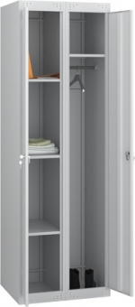 Каждая секция закрывается на свой ключ (замки в комплекте), в одной из секции возможно установить только полки, в другой полку под головной убор, крючки и перекладину для одежды. Возможность устанавливать дополнительные полки. В верхней и нижней панелях шкафа предусмотрены вентиляционные отверстия, обеспечивающие проветривание.
