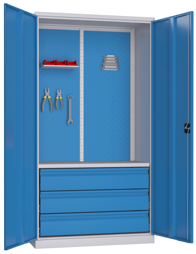 Инструментальные шкафы предназначены для производственных предприятий, ремонтных мастерских, гаражей и т.д. Используются для хранения инструмента и оснастки. Ригельная система запирания. Поверхность окрашена порошковой цвет серый RAL 7038, дверцы, ящики и экраны — синие RAL 5012. Шкаф закрывается на замок «EURO- LOCKS» (Германия). Шкаф укомплектован 3 выдвижными ящиками и 1 полкой. Максимальная нагрузка на ящик — 40 кг. Максимальная нагрузка на полку — 60 кг. На экран с помощью зацепов навешиваются аксессуары.