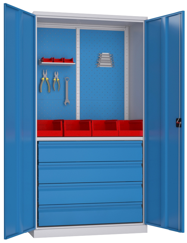 Инструментальные шкафы предназначены для производственных предприятий, ремонтных мастерских, гаражей и т.д. Используются для хранения инструмента и оснастки. Ригельная система запирания. Поверхность окрашена порошковой цвет серый RAL 7038, дверцы, ящики и экраны — синие RAL 5012. Шкаф закрывается на замок «EURO- LOCKS» (Германия). Шкаф укомплектован 4 выдвижными ящиками и 1 полкой. Максимальная нагрузка на ящик — 40 кг. Максимальная нагрузка на полку — 60 кг. На экран с помощью зацепов навешиваются аксессуары.