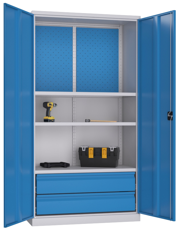 Инструментальные шкафы предназначены для производственных предприятий, ремонтных мастерских, гаражей и т.д. Используются для хранения инструмента и оснастки. Ригельная система запирания. Цвет серый RAL 7038, дверцы, ящики и экраны — синие RAL 5012. Шкаф закрывается на замок «EURO- LOCKS» (Германия). Шкаф укомплектован 3 выдвижными ящиками и 3 полками. Максимальная нагрузка на ящик — 40 кг. Максимальная нагрузка на полку — 60 кг. На экран с помощью зацепов навешиваются аксессуары.