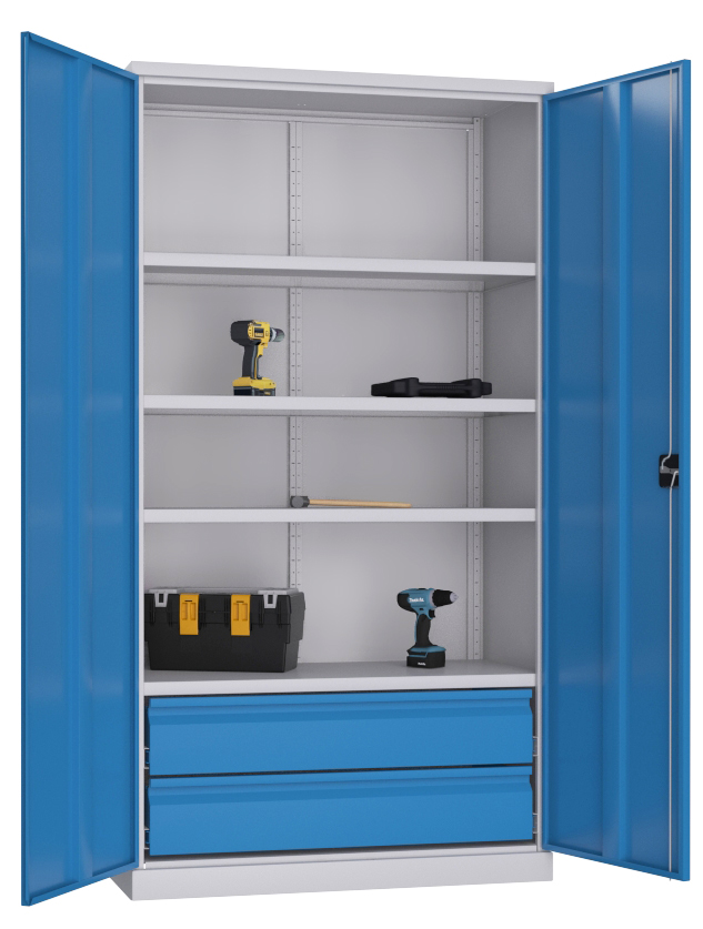 Шкаф инструментальный с полками предназначен для производственных предприятий, ремонтных мастерских, гаражей и т.д. Используются для хранения инструмента и оснастки. Ригельная система запирания. Цвет серый RAL 7038, дверцы, ящики и экраны — синие RAL 5012. Шкаф закрывается на замок «EURO- LOCKS» (Германия). Шкаф укомплектован 2 выдвижными ящиками и 4 полками. Максимальная нагрузка на ящик — 40 кг. Максимальная нагрузка на полку — 60 кг. На экран с помощью зацепов навешиваются аксессуары.