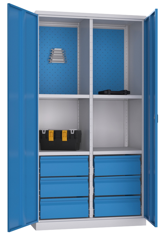 Инструментальные шкафы предназначены для производственных предприятий, ремонтных мастерских, гаражей и т.д. Используются для хранения инструмента и оснастки. Ригельная система запирания. Цвет серый RAL 7038, дверцы, ящики и экраны — синие RAL 5012. Шкаф закрывается на замок «EURO- LOCKS» (Германия). Шкаф укомплектован 6 выдвижными ящиками и 4 полками. Максимальная нагрузка на ящик — 40 кг. Максимальная нагрузка на полку — 60 кг. На экран с помощью зацепов навешиваются аксессуары.
