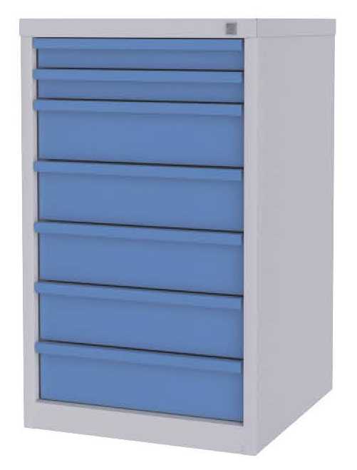 Драйвер для слесарного верстака с 7мью выдвижными ящиками, запирающимися на центральный ключевой замок. Допустимая нагрузка на каждый ящик - 30 кг. Тумба инструментальная металлическая с выдвижными ящиками отличается прочностью и долговечностью. Элементы драйвера окрашены эпоксидной порошковой краской, устойчивой к механическим воздействиям и агрессивным жидкостям. Ящики – цвет темно-синий RAL5015, корпус – цвет серый RAL7035.
