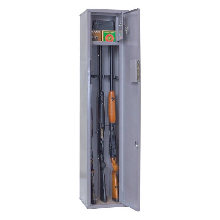 Шкаф односекционный, на 3 ствола оснащен отделением под патроны. Ложементы — пластик. В дверь установлены 1 замок типа «Cam-Lock» и 1 ключевой 8-ми сувальдный замок или аналогичный замок другого производителя.