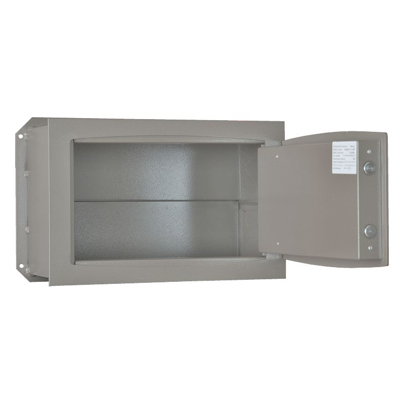 Дверь шкафа оснащена сейфовым замком сувальдного типа. Корпус сейфа толщиной 2 мм, лицевая панель и дверь толщиной 5 мм. На задней стенке корпуса расположены отверстия для крепления. Сейф оснащен съемной полкой.