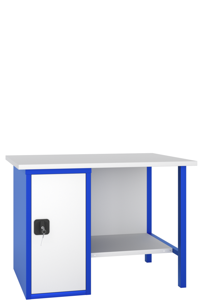 Верстак Альфа 3 предназначен для оборудования рабочих мест на промышленных предприятиях, в мастерских и гаражах. Нагрузка на столешницу 600 кг. Столешница верстака слесарного оцинкована. Он укомплектован тумбой с 2-мя регулируемыми по высоте полками с дверью и замком. Верстак окрашен полимерной порошковой краской серого (RAL 7035) и синего (RAL 5005) цвета.