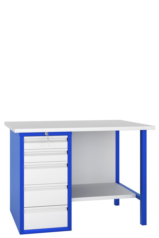 Распределенная нагрузка на столешницу до 600 кг. Столешница верстака оцинкована. Верстак укомплектован тумбой с 5 выдвижными ящиками на телескопических направляющих, которые позволяют выдвигать их на 100%. Ящики запираются на замок. Верстак имеет верстачную опору и комплект полок. Верстак Альфа окрашен полимерной порошковой краской серого (RAL 7035) и синего (RAL 5005) цвета.